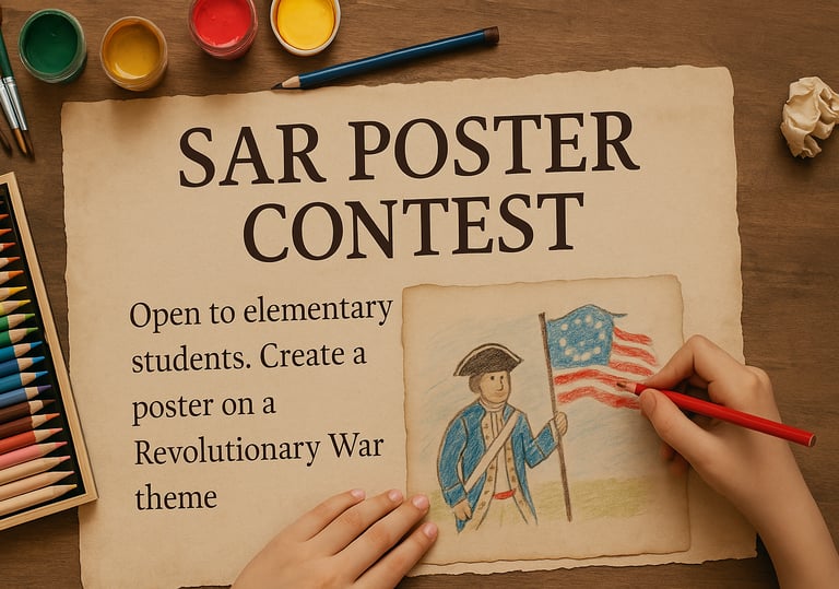This contest is for elementary students (grades 3–5). Students create a poster focused on a selected theme, such as “Revolutionary War Events” (even years) or “Founding Figures” (odd years).