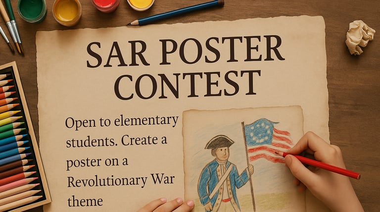 This contest is for elementary students (grades 3–5). Students create a poster focused on a selected theme, such as “Revolutionary War Events” (even years) or “Founding Figures” (odd years).