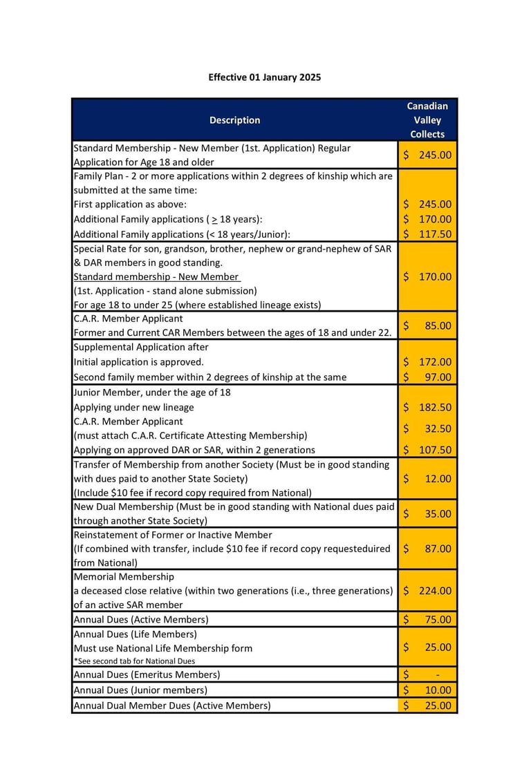 Membership in the Canadian Valley Chapter of the Sons of the American Revolution includes annual dues that help support our chapter’s programs, state and national society activities, and community outreach. These funds ensure we can continue promoting patriotism, preserving Revolutionary War history, and supporting educational initiatives.